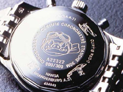 This one is still very mysterious to me; I don't even know its formal name. With its red hands and black subdials, that's certainly a unusual piece. Its caseback shows several float boats. The artwork apparently comes from the animation movie Porco Rosso directed by Miyazaki from Studio Ghibli.
